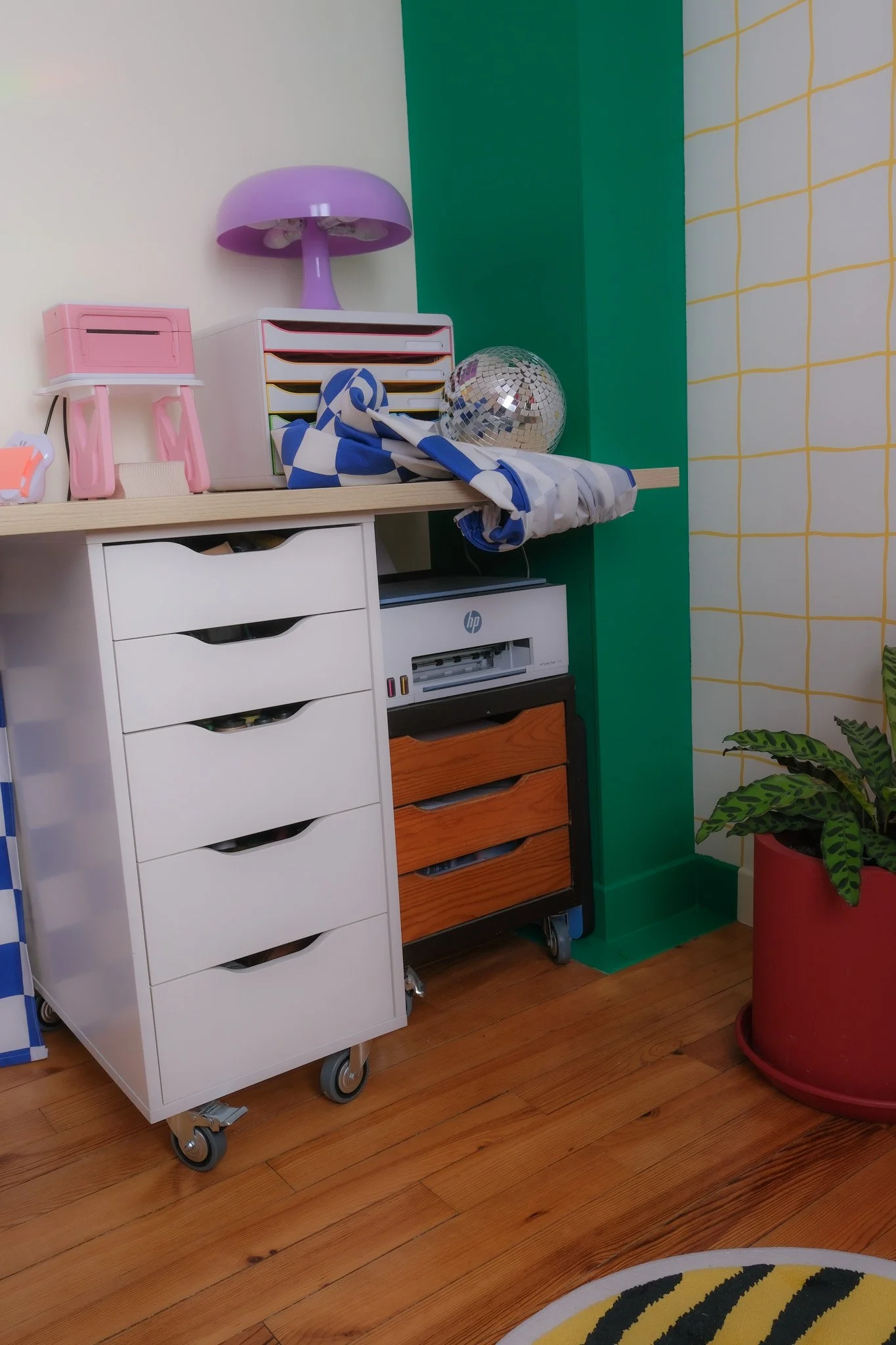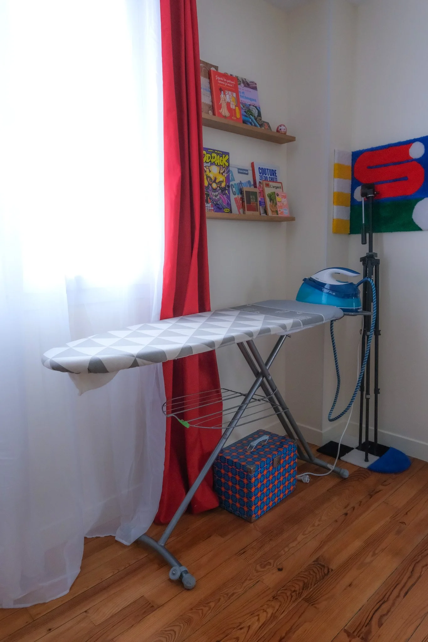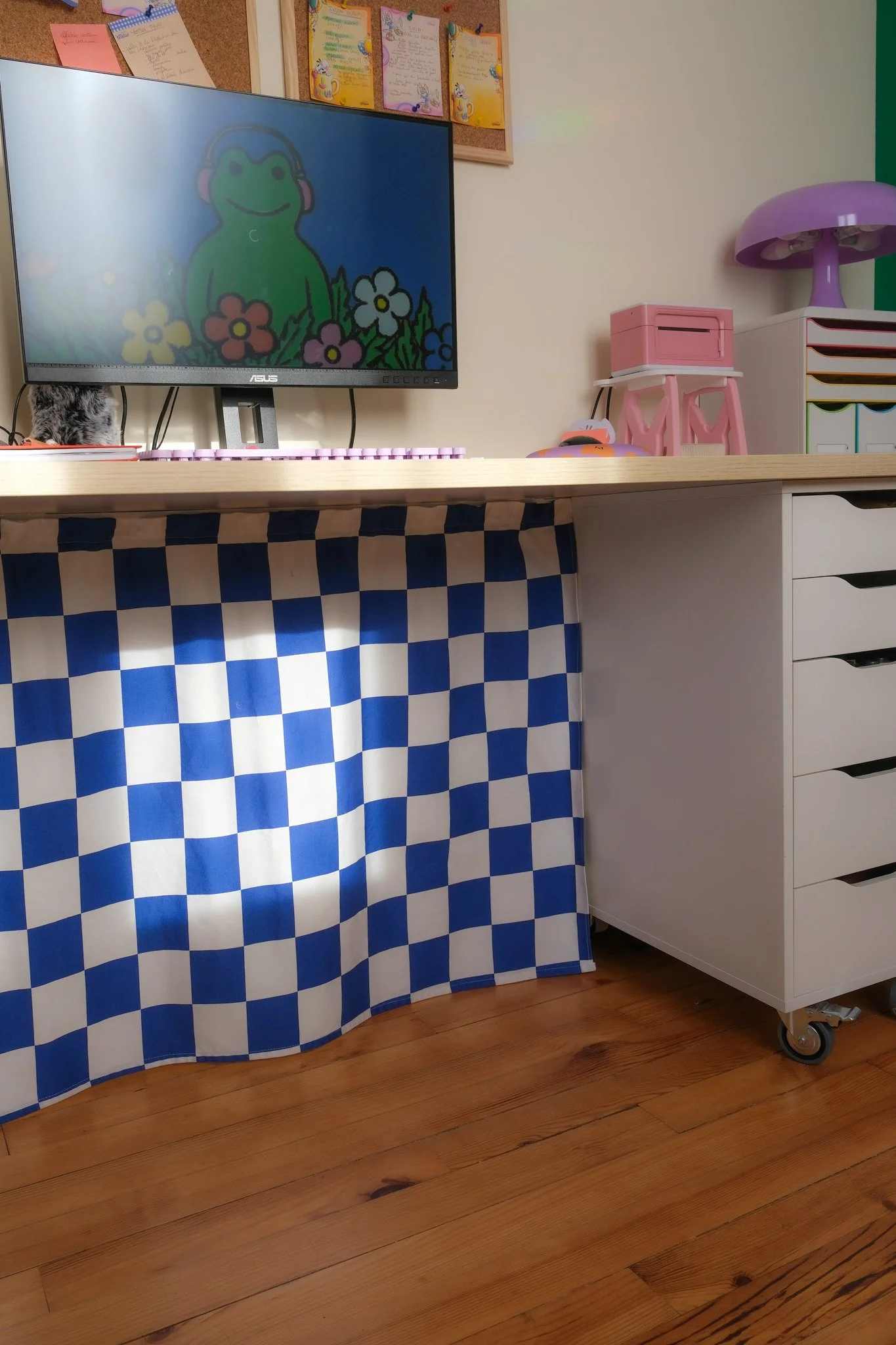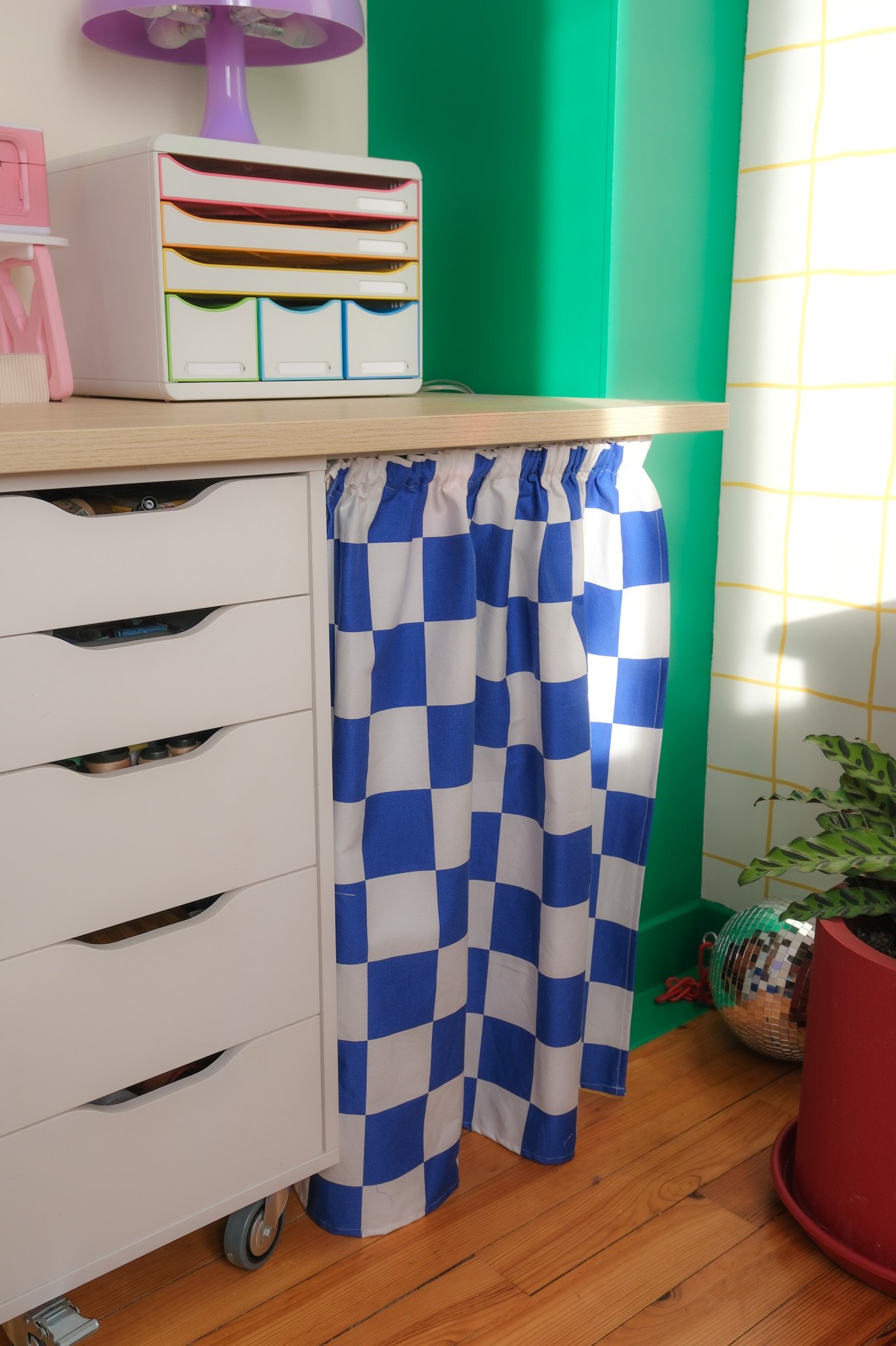 Résultat ? mes câbles et mon imprimante ont disparus derrière un rideau fun & coloré ! (d’ailleurs j’ai ramené ce tissu à carreaux du japon, donc en un coup d’oeil il me rappelle mon voyage !)